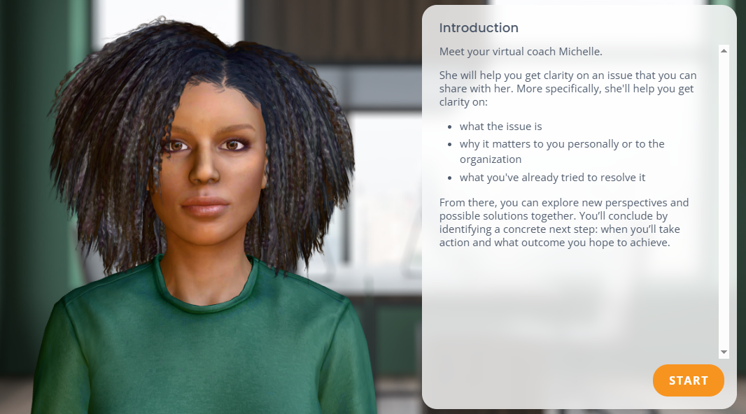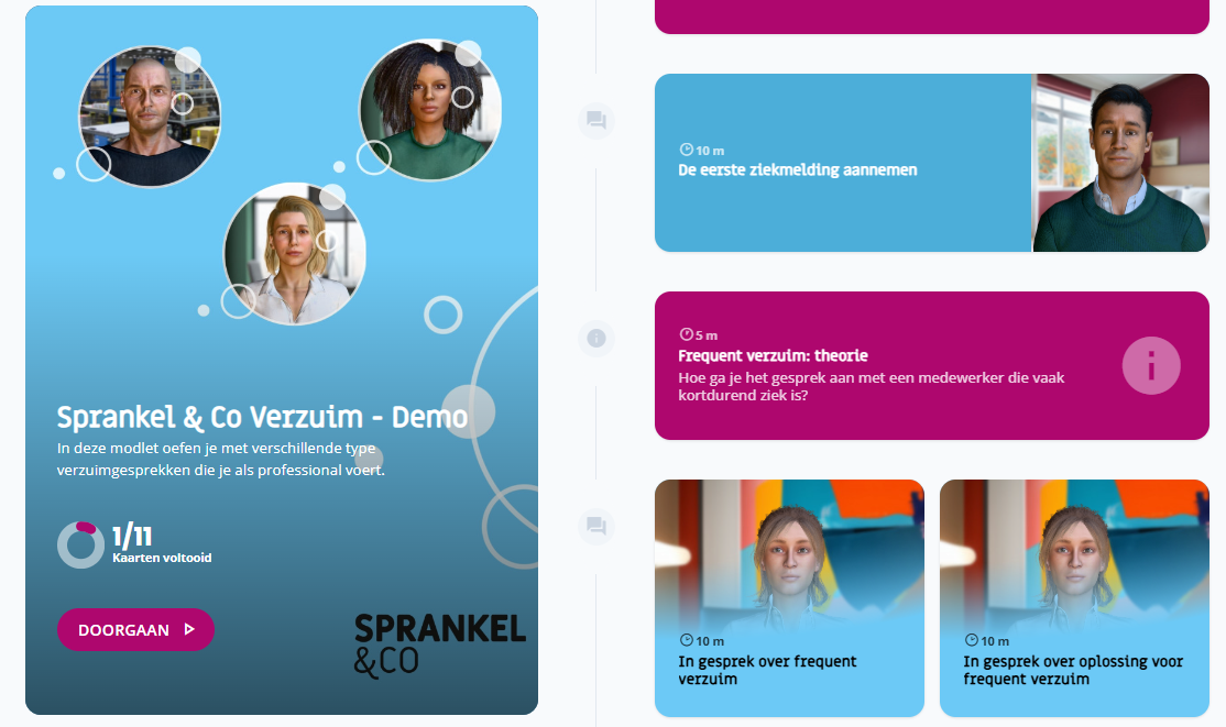 Deelnemers brengen eerst hun situatie of vraag in kaart. Daarna oefenen ze met een avatar, die hen uitdaagt om nieuw gedrag te laten zien. De avatar reageert op hun keuzes en geeft directe feedback op houding, woordgebruik of aanpak. Zo ontstaat een krachtige, veilige leeromgeving waarin je echt kunt experimenteren met nieuwe vaardigheden.